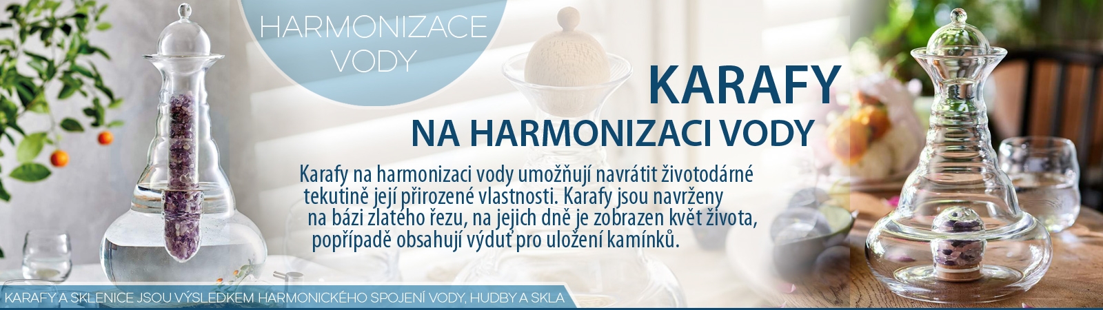 Karafy a džbány na harmonizaci vody umožňují navrátit životodárné tekutině její přirozené vlastnosti. Karafy jsou navrženy na bázi zlatého řezu, na jejich dně je zobrazen květ života, popřípadě obsahují výduť pro uložení kamínků.